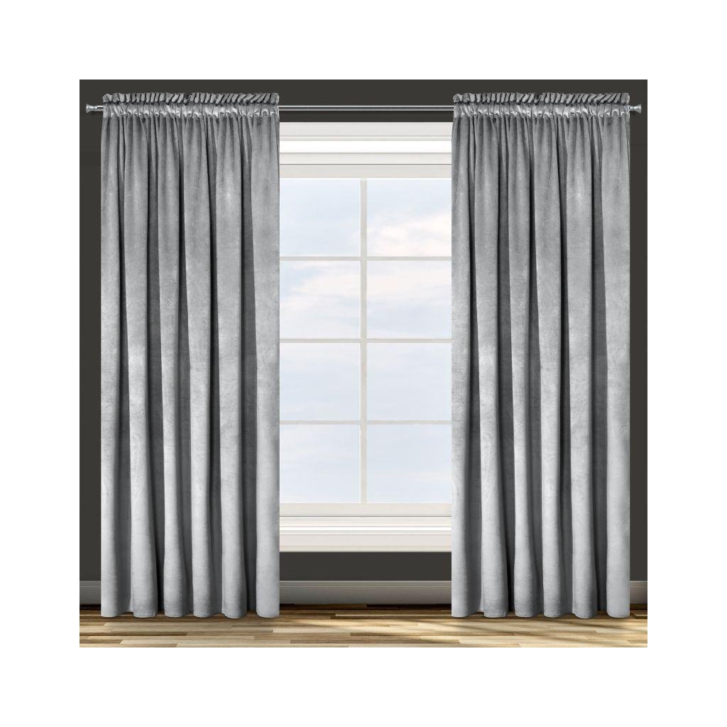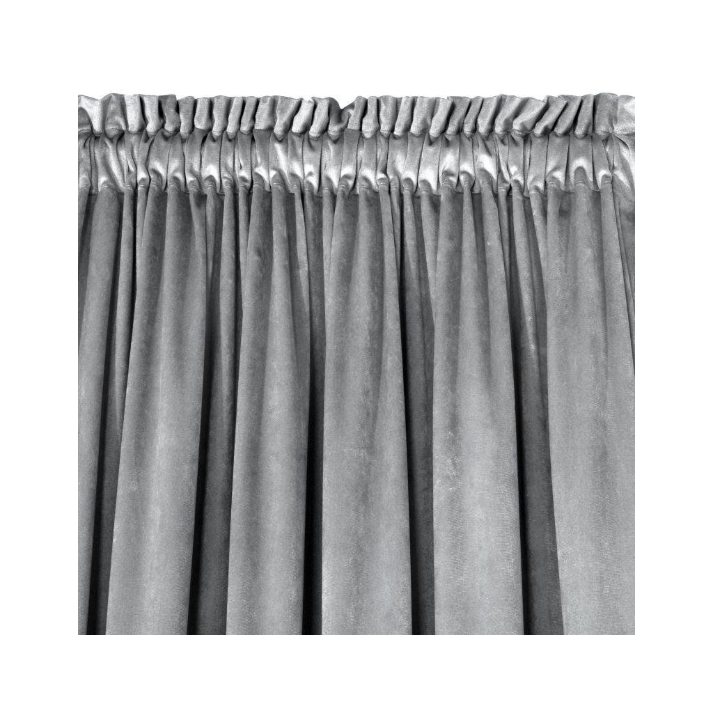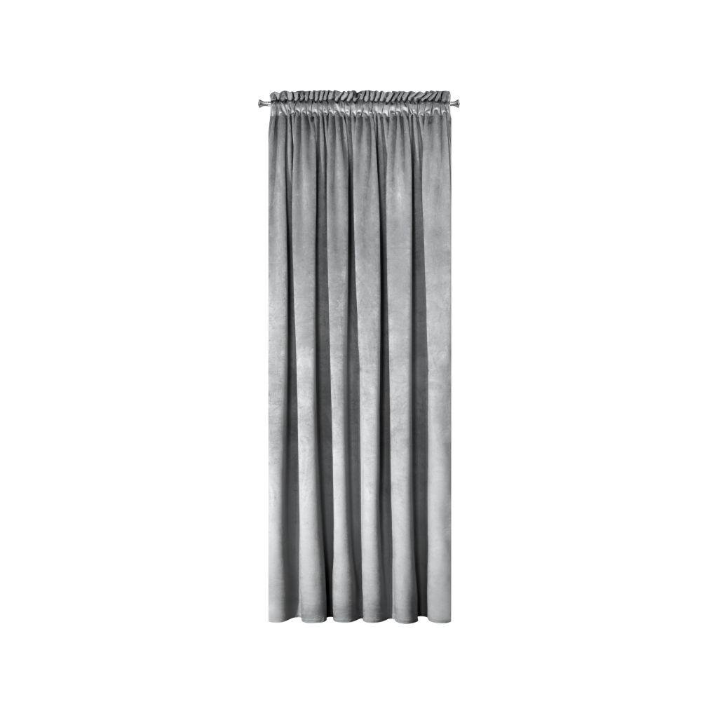 Zamatový jednofarebný strieborný záves. Zamatová látka s hustotou 200g/m2 poskytuje stredný stupeň vnútorného zatemnenia. Šírka: 135 cm, dĺžka: 300 cm. Zloženie: 100% polyester. Praktické zavesenie na riasiacej páske.