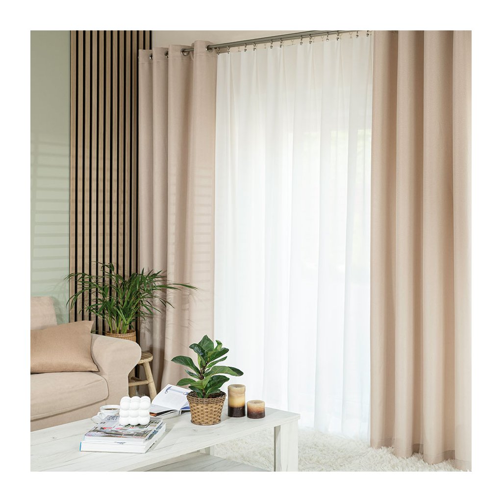 Polozatemňovacie prevedenie prirodzene tlmí denné svetlo a zvyšuje súkromie bez úplného zatemnenia. Materiál 100% polyester s príjemnou gramážou cca 170 g/m² drží pravidelné záhyby a pôsobí upravene – ideálny na vytvorenie útulnej, vyváženej atmosféry.