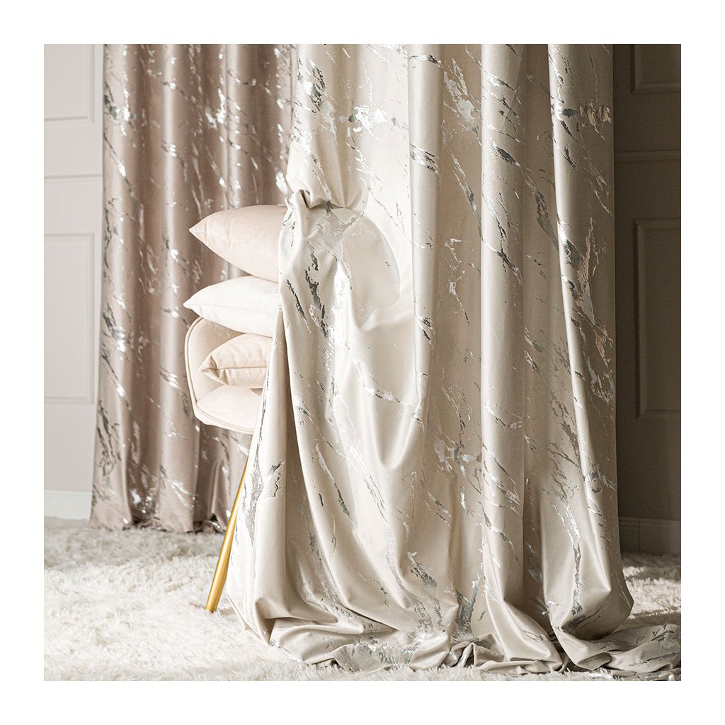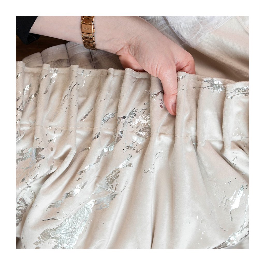 Svetlokrémový zamatový záves so striebornou potlačou na páske MARMA 140x250 cm