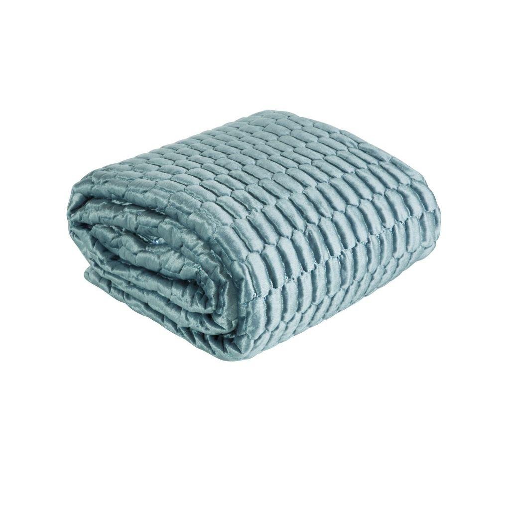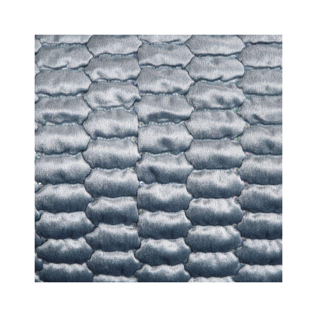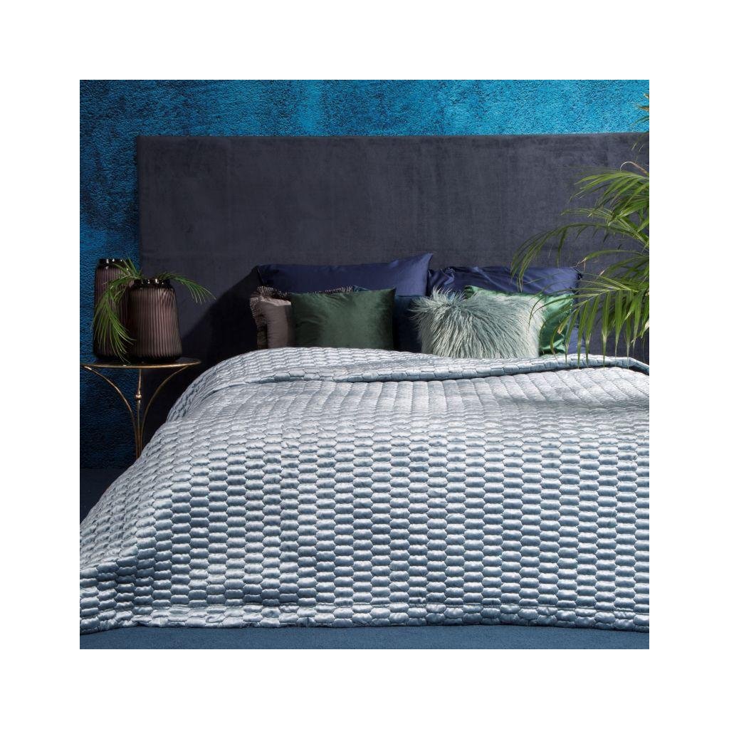 Elegantná prikrývka z lesklého, exkluzívneho zamatu jemne modrej farby, zdobená jemným geometrickým prešívaním a akcentmi lesklých flitrov. Rozmer 220 x 240 cm