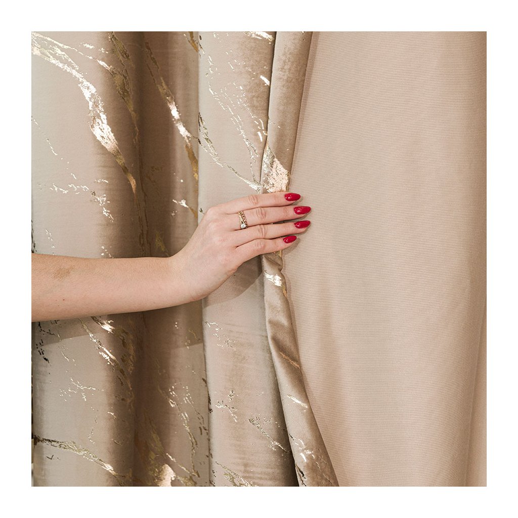 Luxusný zamatový záves MARMA s metalickou mramorovou potlačou prepojí eleganciu a moderný štýl. Husto tkaný velvet krásne splýva, má jemný noblesný lesk a na okne vytvára galerijný efekt – výrazný, no stále vkusný akcent.