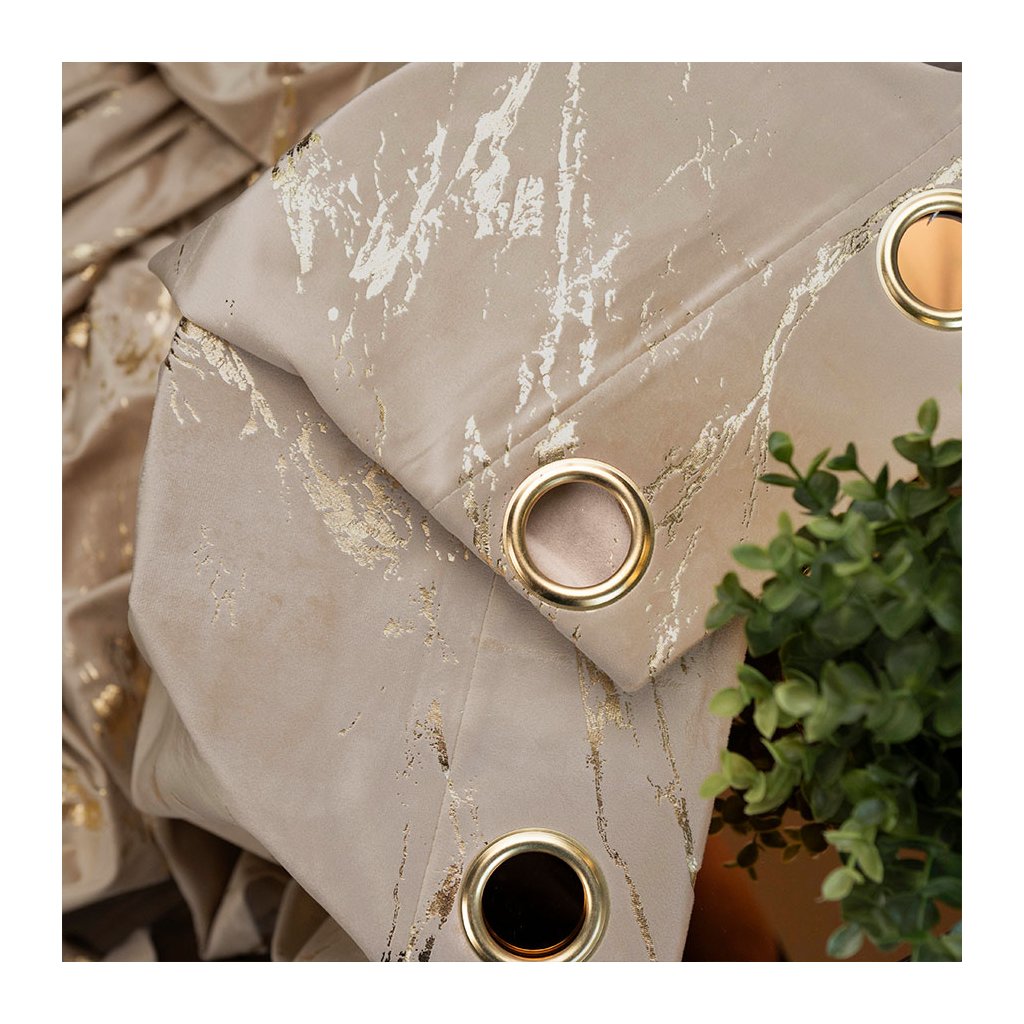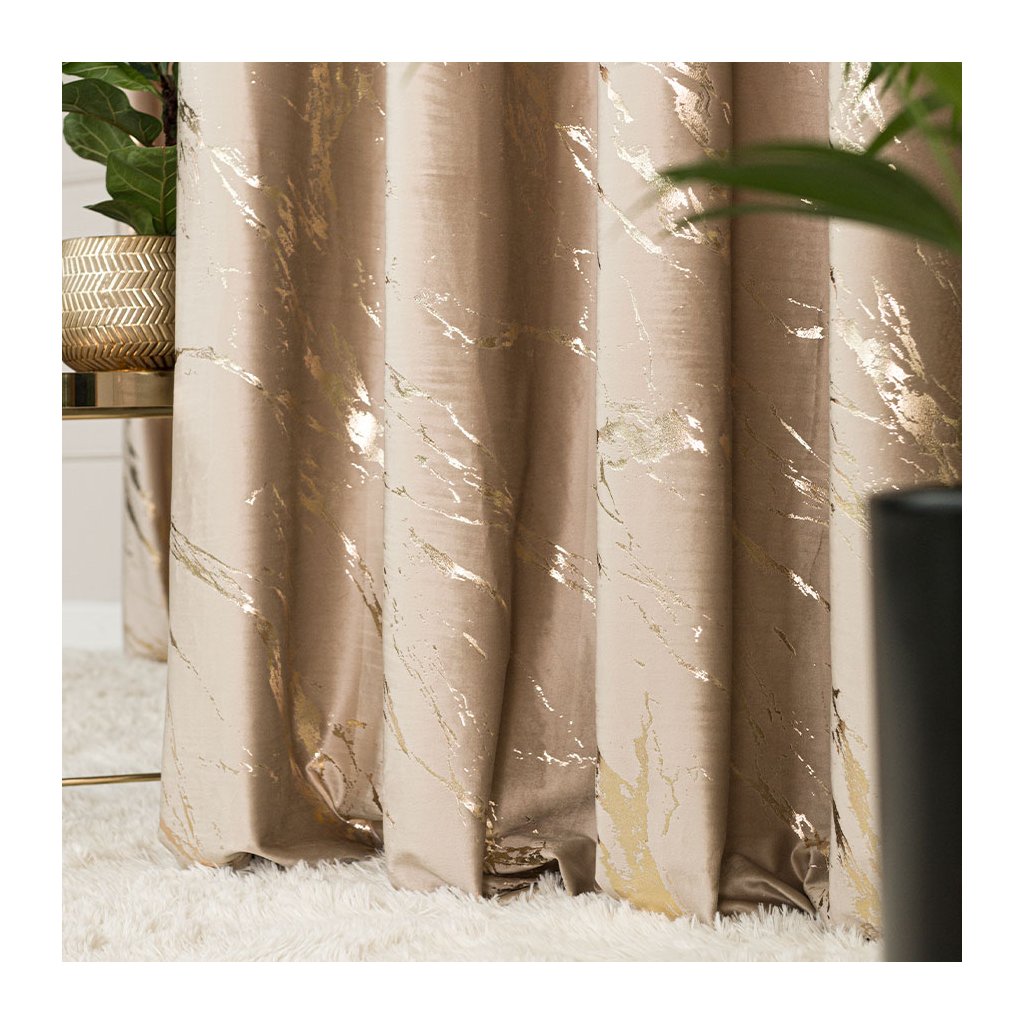 Tmavobéžový zamatový záves so zlatou potlačou na krúžkoch MARMA 140x250 cm