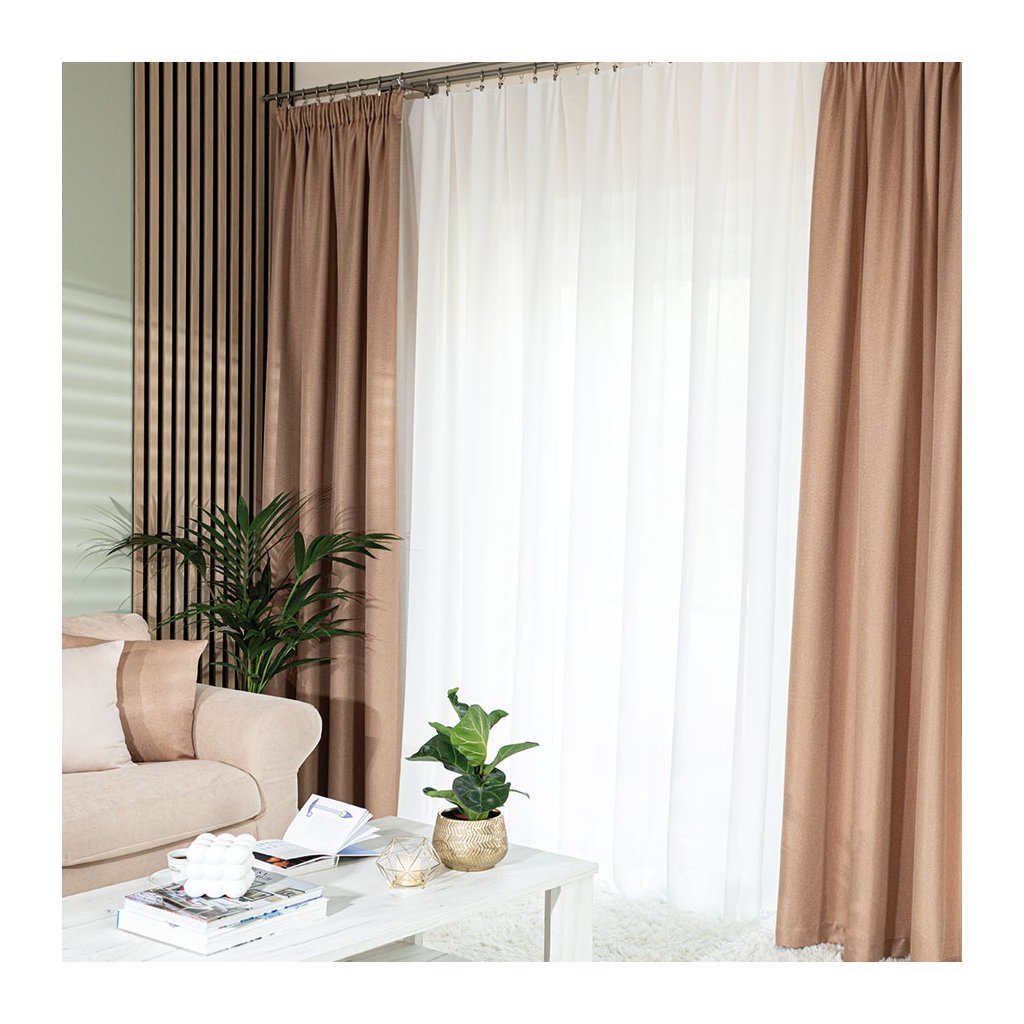 Polozatemňovacie prevedenie prirodzene tlmí denné svetlo a zvyšuje súkromie bez úplného zatemnenia. Materiál 100% polyester s príjemnou gramážou cca 170 g/m² drží pravidelné záhyby a pôsobí upravene – ideálny na vytvorenie útulnej, vyváženej atmosféry.