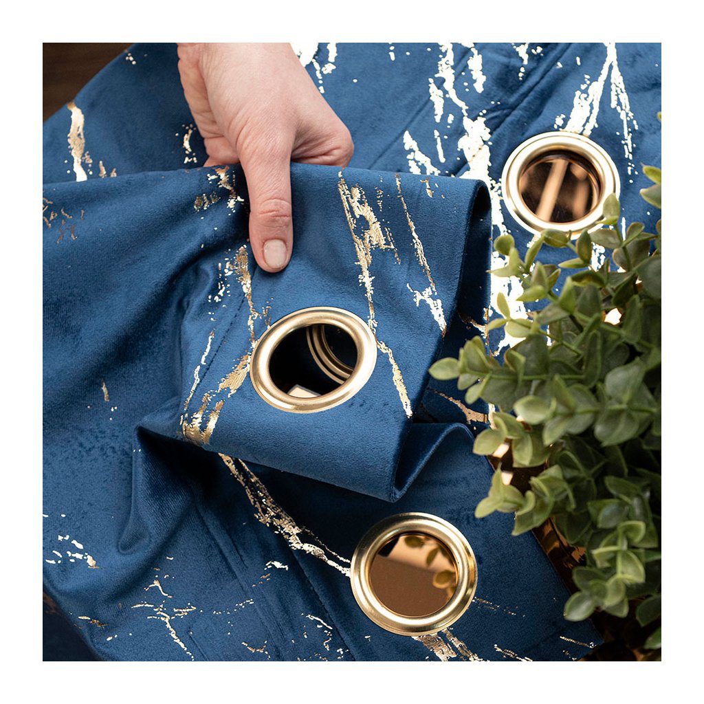 Tmavomodrý zamatový záves so zlatou potlačou na krúžkoch MARMA 140x250 cm