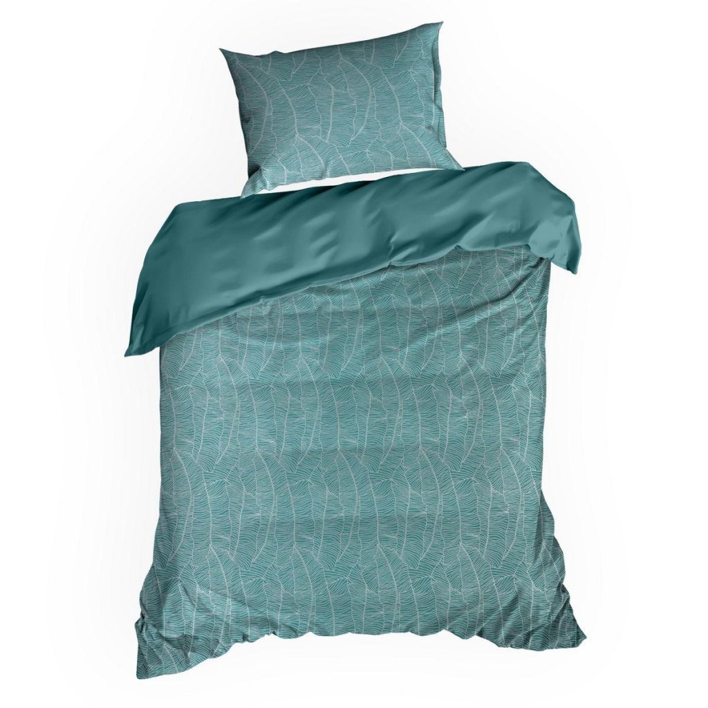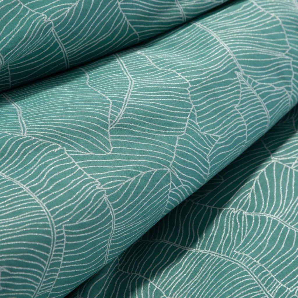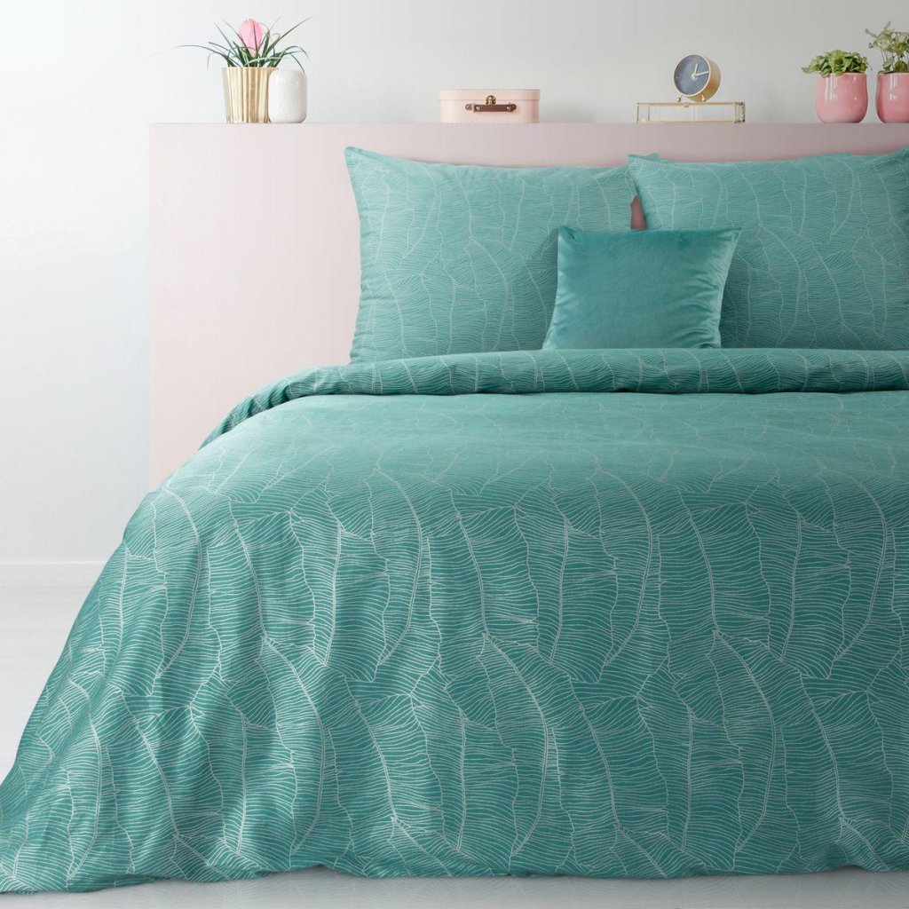 Hľadáte nápad na praktický a elegantný darček zároveň? Súprava obliečok z kolekcie BOX je vyrobená z kvalitného bavlneného saténu a zdobená metalickou potlačou s motívom banánových listov. Saténová tkanina s hodvábnym leskom, ktorá je praktická na údržbu a ľahko sa žehlí, umožňuje pokožke dýchať a zaisťuje pohodlný spánok. Zlatá potlač a grafický vzor na tyrkysovom podklade dodávajú interiéru spálne módny charakter. Spodná strana obliečky na paplón je vyrobená z hladkej hladkej látky bez potlače. Moderná technika tlače zaručuje čistý vzor a jasné farebné prechody a zaisťuje, že vzor nestráca na intenzite ani po mnohých praniach. Praktický zips všitý na jednej z bočných strán umožňuje rýchlu a jednoduchú výmenu obliečky.