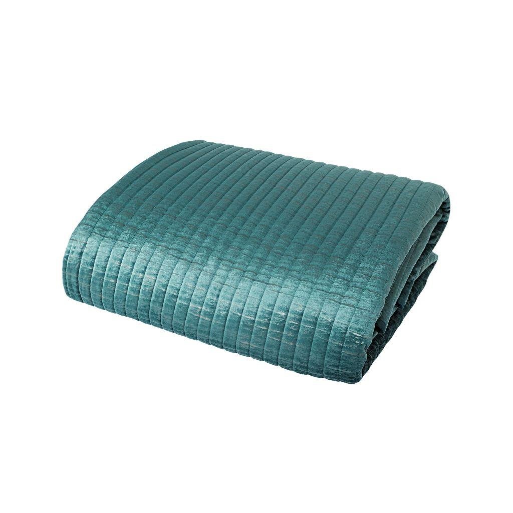 Prikrývka na posteľ ALUVIA tyrkysovej farby z mäkkého zamatu s trblietavou potlačou, prešívaná tradičnou metódou. Možno prať v práčke. 220x240 cm