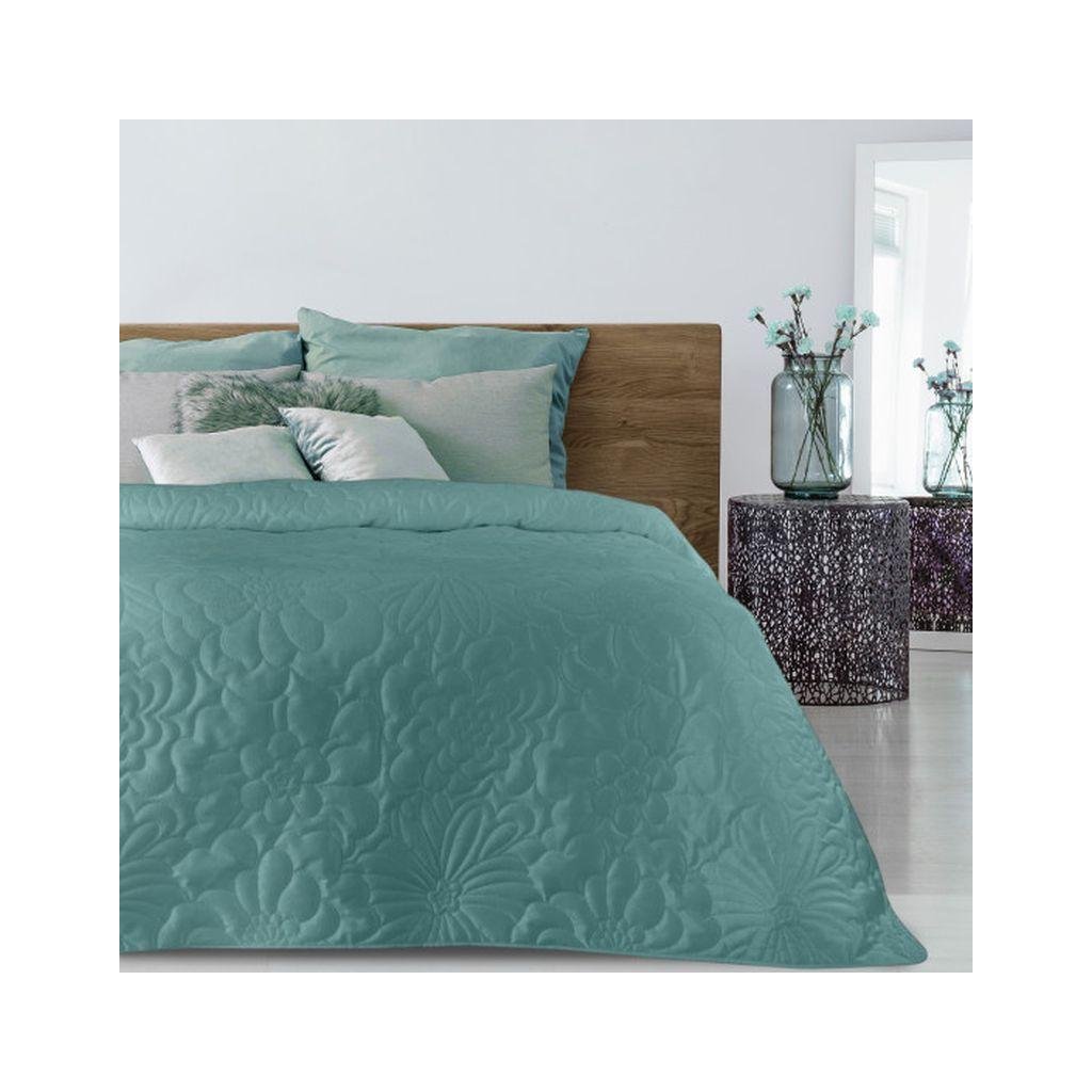Klasický a veľmi elegantný prehoz tyrkysovej farby z mäkkého zamatu, prešívaný módnym vzorom. Prešívanie metódou hotpress. Možno prať v práčke. 220x240 cm.