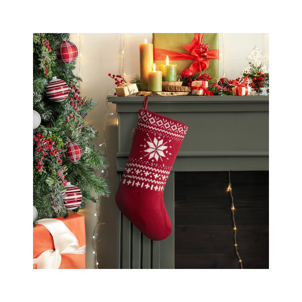 Vianočná ponožka na darčeky z mäkkej pleteniny s sviatočným vzorom krásne vynikne na krbe, zábradlí či poličke a dotvorí atmosféru v každej miestnosti. Vďaka univerzálnemu vzhľadu sa hodí k rôznym štýlom interiéru a ľahko ju zladíte s ostatnými dekoráciami – bez ohľadu na rozmer, farbu či spôsob zavesenia.