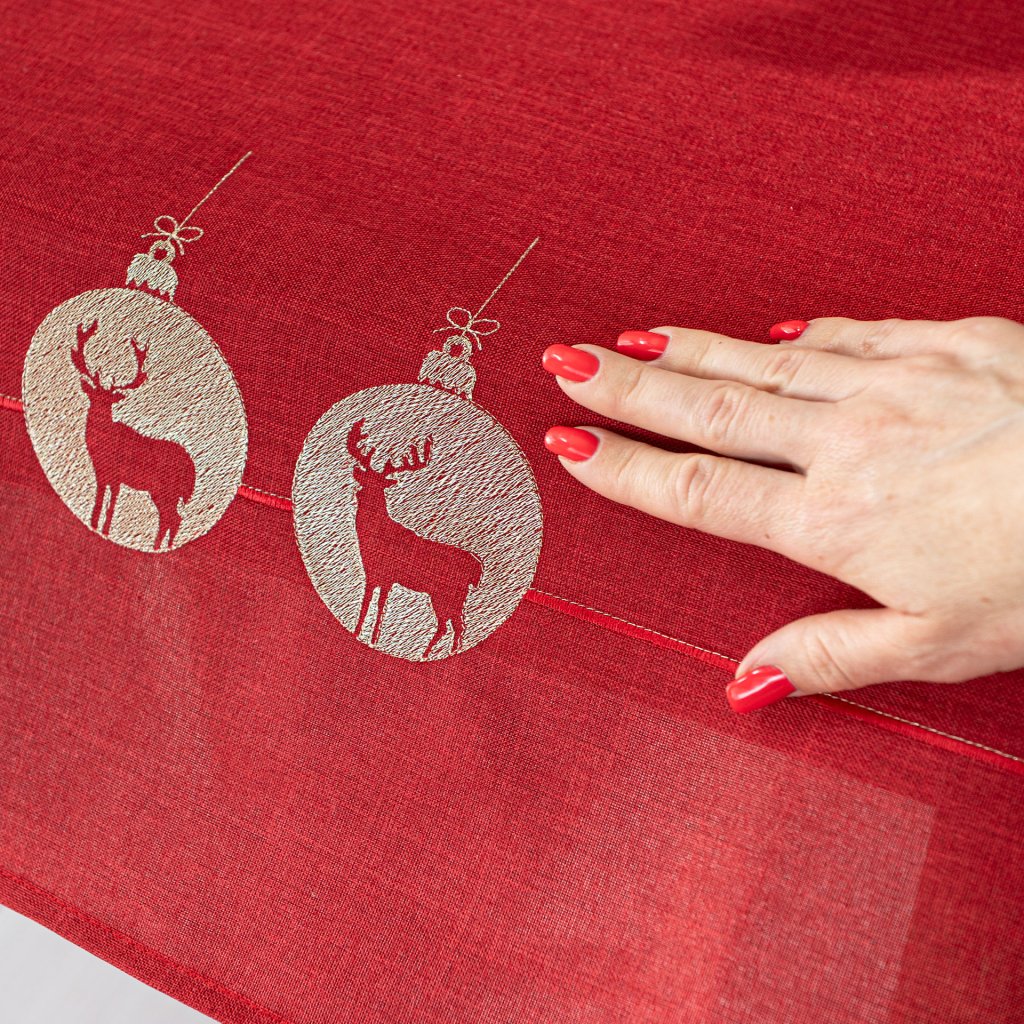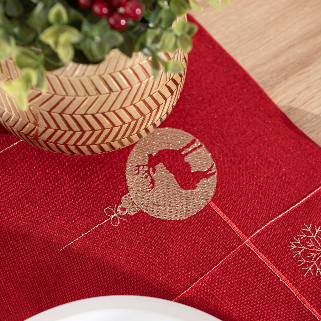 Behúň je vyrobený z kvalitnej a pevnej látky, ktorá je nielen vizuálne pôsobivá, ale aj praktická a odolná pri každodennom používaní. Jeho bohatý vianočný motív dodáva stolu slávnostný a elegantný vzhľad. Vďaka precíznemu spracovaniu je vhodný aj pre opakované použitie počas viacerých sezón.