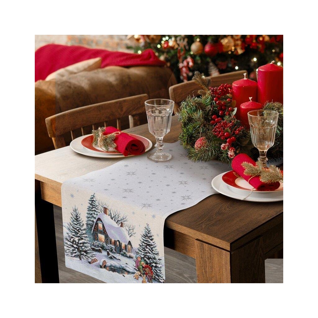 Vianočný gobelínový behúň na stôl z hrubej pevnej látky s tkaným vzorom dodá interiéru počas najkrajších sviatkoch roka sviatočnú atmosféru pokoja, lásky a radosti. Gramáž: 450 g/m2, Zloženie: 43% polyester 40% akryl 17% bavlna