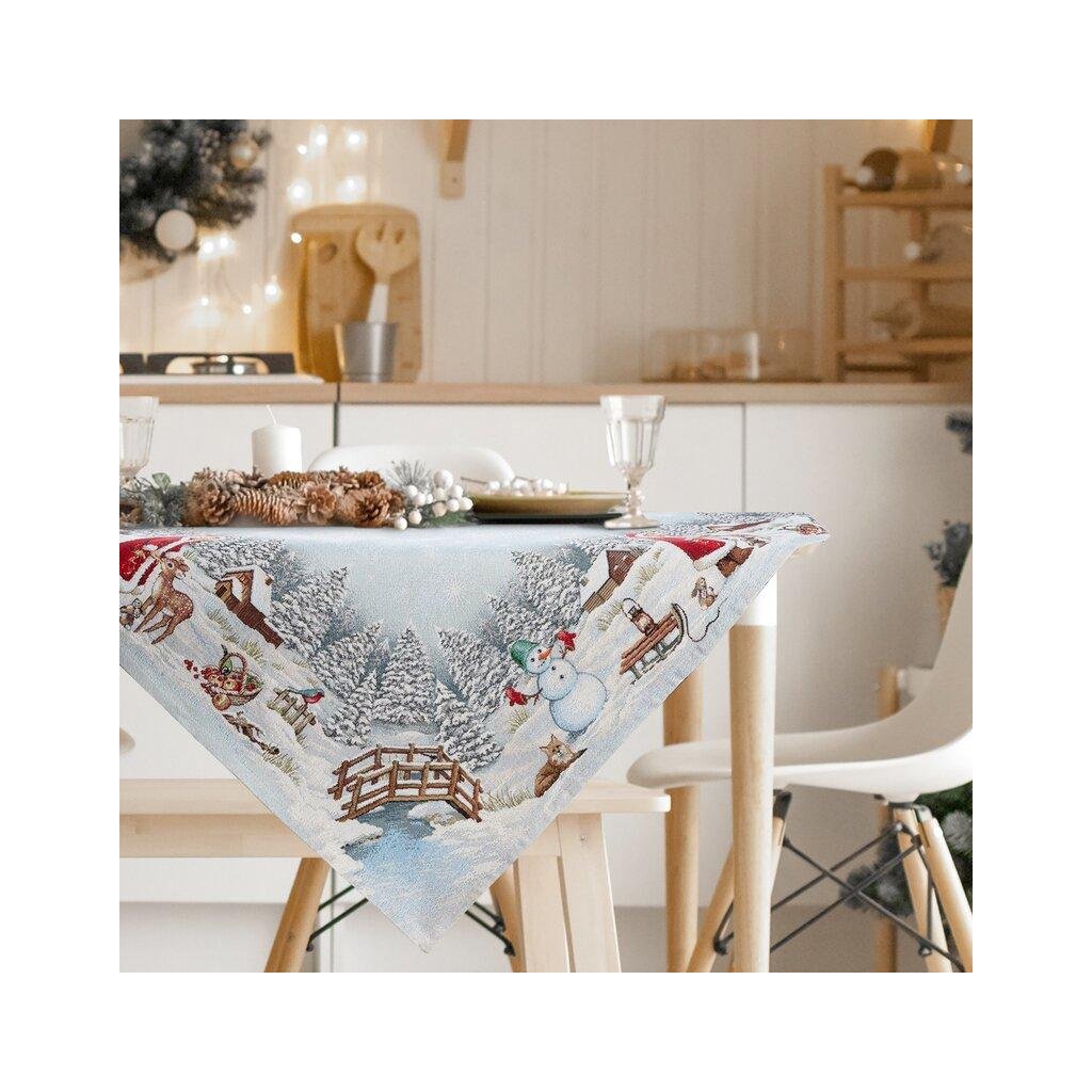 Vianočný gobelínový obrus na stôl z hrubej pevnej látky s tkaným vzorom dodá interiéru počas najkrajších sviatkoch roka sviatočnú atmosféru pokoja, lásky a radosti. Gramáž: 450 g/m2, Zloženie: 43% polyester 40% akryl 17% bavlna