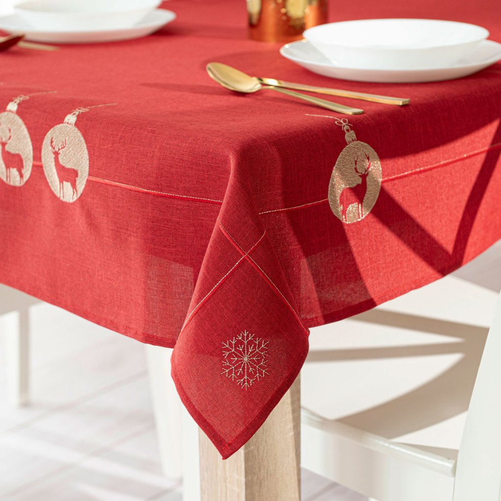 Vianočný obrus s elegantným sviatočným motívom premení váš stôl na útulné a slávnostné miesto pre spoločné chvíle. Jemne zdobený dezén pôsobí nadčasovo a upravene, na stole pekne drží tvar a vytvára harmonický základ pre prestieranie – od adventných raňajok až po Štedrú večeru.