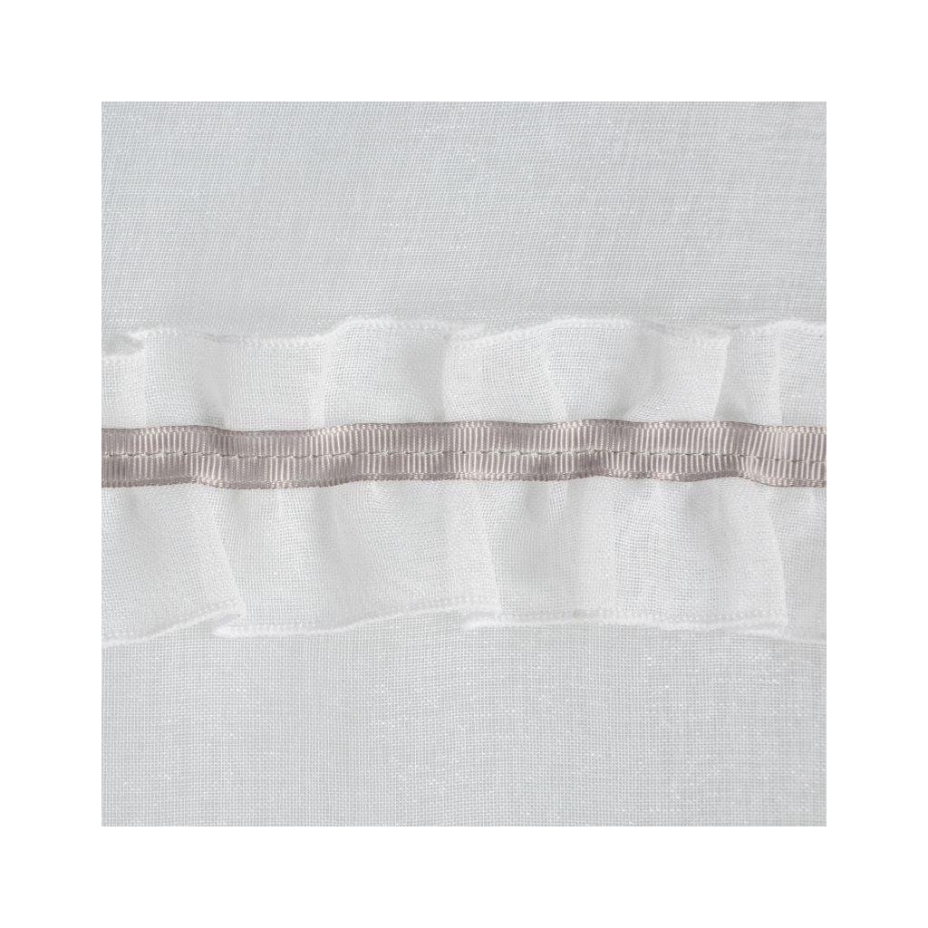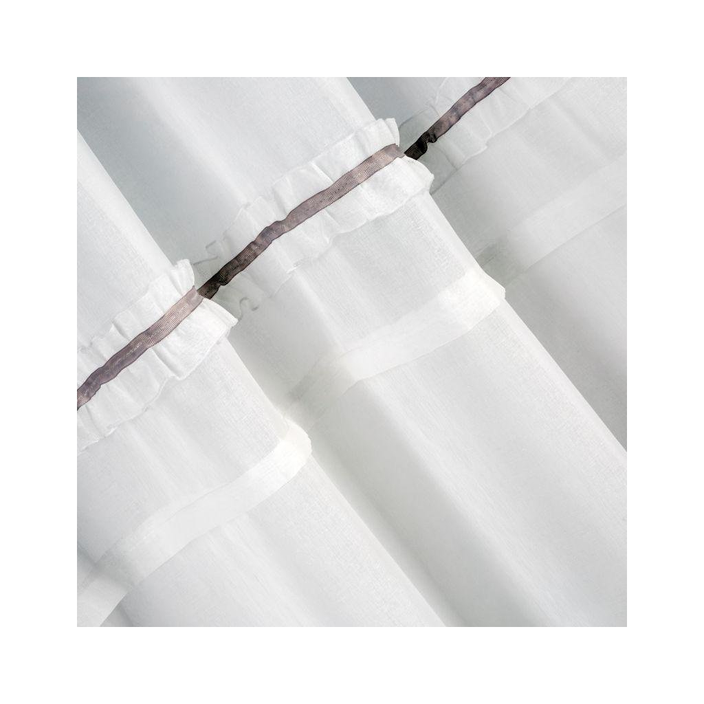 Jemná záclona bielej farby tradičného vzhľadu. Hladká polyesterová tkanina je zdobená jemným lemovaním a volánikmi. Jemné farby a tradičný vzor.